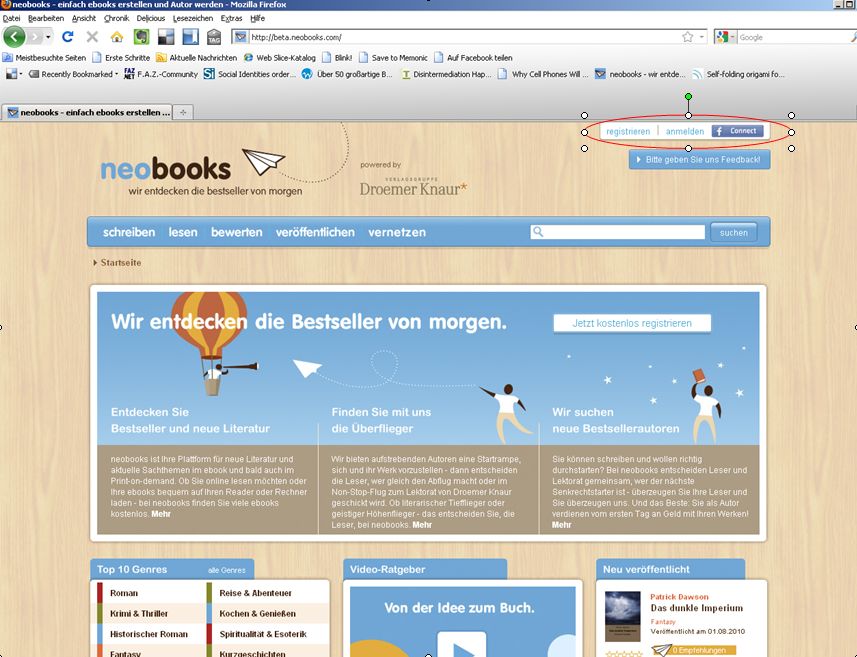 2. Sobald Sie auf http://beta.neobooks.com/ sind, sollten Sie rechts oben unter „registrieren“ einen eigenen Benutzernamen und ein persönliches Passwort anlegen. Damit können Sie sich dann immer auf dem Beta-System anmelden.