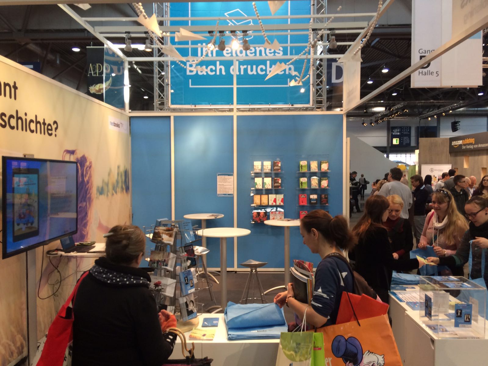 Vollgepackt mit unseren schönen neobooks-Taschen und den vielen tollen Autogrammkarten von unserer Aktion sowie den Selfies für die neobooks #meinBuch-Wand fuhren wir am Mittwoch nach Leipzig. Noch bis spät am Abend wurde fleißig gebohrt und geschraubt, sodass wir am Donnerstag voller Stolz unseren tollen Messestand den vielen Besuchern präsentieren konnten. Und so starteten wir sogleich mit den ersten Info-Veranstaltungen. Evi und Carina erklärten alles zum Thema SEO und Metadaten und was Autoren bei Social-Media beachten müssen.
