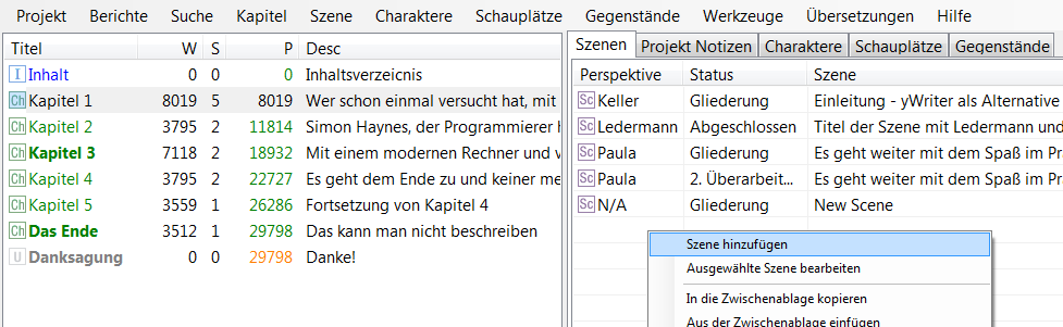 Mit einem Rechtsklick auf die Liste der Szenen wird eine weitere angelegt. Es öffnet sich automatisch der Editor für diese neu angelegte Szene. Die Registerkarte „Inhalt“ enthält den Text der Szene, also den eigentlichen Buchtext. Die Inhalte aller anderen Tabs sind organisatorischer Natur und beinhalten Notizen, Informationen über den Bearbeitungsstatus, die Perspektivfigur, die involvierten Figuren und den Schauplatz. Sogar ein Bild lässt sich pro Szene hinterlegen.