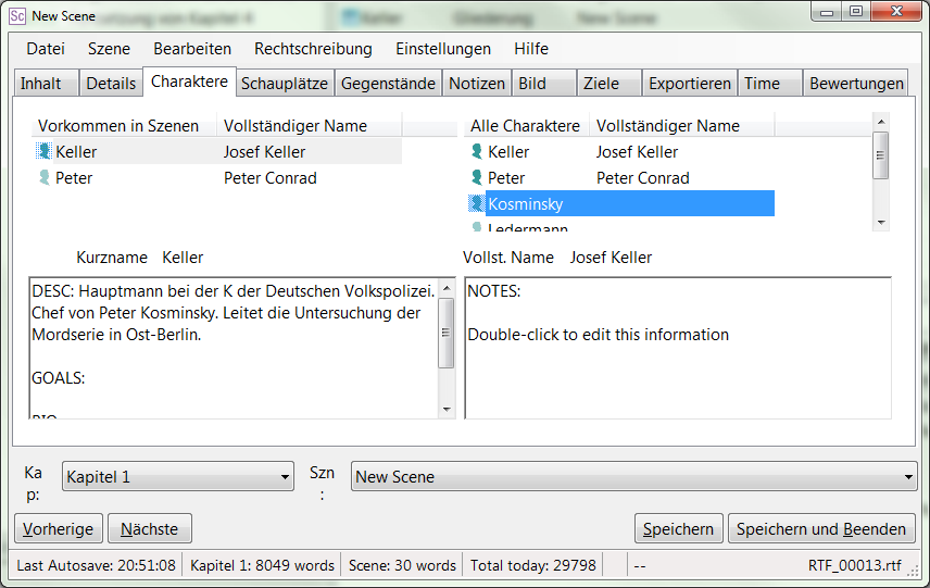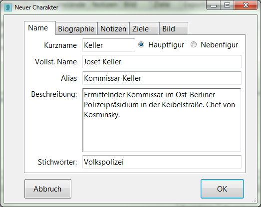 Bei der Einführung einer neuen Figur beispielsweise wechselt man auf die Registerkarte „Charaktere“, klickt mit der rechten Maustaste in die Liste der Charaktere und kann im erscheinenden Dialog alle notwendigen Personalinformationen eingeben. Mit „OK“ wird der Charakter angelegt und erscheint auf der rechten Seite in der Gesamtbesetzung.