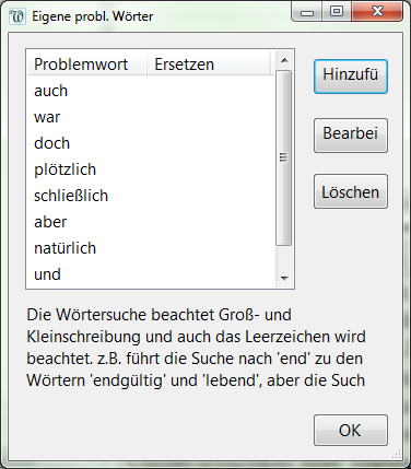 …geht die Arbeit in der Regel erst richtig los. Dazu werden die meisten Autoren einiges zu erzählen haben. Wie alle anderen nicht menschlichen Lösungen, so kann auch yWriter nicht lektorieren. Trotzdem gibt es einige Hilfsmittel, um die gröbsten handwerklichen Dinge zu kontrollieren. So lässt sich eine beliebig lange Liste von Problemworten anlegen, die das Programm dann auf Wunsch im Texteditorfenster markiert. Natürlich muss auch diese Liste regelmäßig gepflegt werden, damit sie sinnvoll verwendet werden kann.
