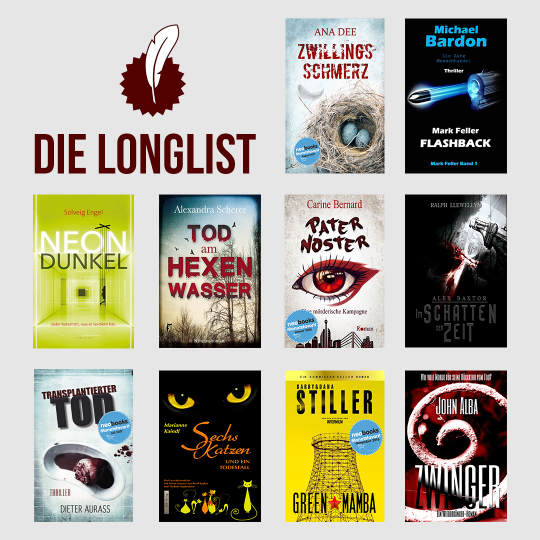Alba, John: „Zwinger“ | Aurass, Dieter: „Transplantierter Tod“ | Bardon, Michael: „Mark Feller – Flashback“ | Bernard, Carine: „Pater Noster“ | Dee, Ana: „Zwillingsschmerz“ | Engel, Solveig: „Neondunkel“ | Kaindl, Marianne: „Sechs Katzen und ein Todesfall“ | Llewellyn, Ralph: „Im Schatten der Zeit“ | Scherer, Alexandra: „Tod am Hexenwasser“ | Stiller, Dana & Barry: „Green Mamba“